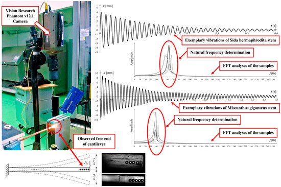 The solution for a cantilever beam with a non-uniform cross section can be used for many purposes. One of them can be a reverse method of exact determination of mechanical properties in natural plant stems or other materials undergoing non-uniformity of the cross section. An example is the method suggested, but not explained thoroughly, by the authors in our earlier works [1,2]. The determination of the modulus of elasticity, being a main goal of a procedure, was based on the first plant stems’ cantilevers’ eigenfrequency. Vibrations were induced manually and oscillations of the free end of the cantilever were measured in time using a fast Vision Research Phantom v12.1 Camera with 1000 fps. GOM Correlate software was then used to read increments of deflection u(+) and u(−) on a free end in every frame. It enabled us to create diagrams containing a displacement–time relation. In order to find the first eigenfrequency, fast Fourier transform (FFT) analyses were performed (Figure 1).