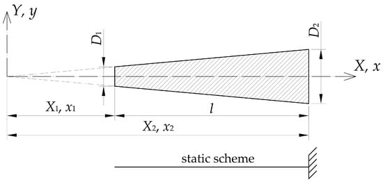 Abdelghany et al. [13] analysed three examples of circular section members implementing several boundary conditions, such as simply supported, clamped–clamped and clamped–roller beam. They employed the differential transformation method. A 3D analysis was performed by Kang and Leissa [14], who examined thick, tapered circular section bars. Results were shown for nine different cases with linear, quadratic and cubic variations of radial thickness. Jaworski [15] utilised the Rayleigh approach to investigate a cantilever column as a truncated cone and a hollow truncated cone. An analytical solution was reached for the first form of the vibrations’ eigenvalue. A differential quadrature method was used, among others, by, Al Kaisy et al. [16], who studied a general non-uniform bar, whereas De Rosa et al. [17] attempted to derive the frequency–axial load relationship for a variable circular section beam. In a preceding paper [18], these authors analysed the dynamic characteristics of beams with a linearly changing cross section with elastic support at the ends. The equation of motion was solved using Bessel functions. The article includes full expressions for the boundary conditions that led to the eigenfrequencies.