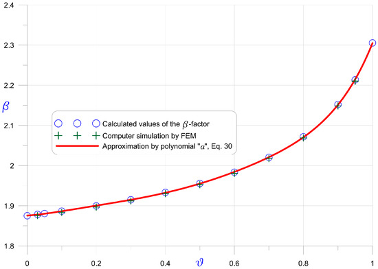 Figure 3 shows the results simultaneously checked using the finite element analyses. The FE model of a tapered pipe was created using shell elements available in Autodesk Simulation Mechanical software. However, the use of FEA has some limitations, such as those regarding obtaining satisfactory results for a conical end of a pipe . The solid line in the graph shows a polynomial approximation of the relationship obtained analytically. A 6th degree polynomial provided an excellent agreement with the results, making it easy to find a correct value of the -factor. The maximum difference of the values determined by the polynomial did not exceed , which was completely sufficient in practical applications and experimental results. The equation of the polynomial used is (30):