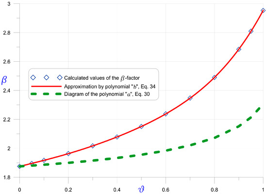 Figure 4 shows the results of the -factor calculations, in dependence on the tapering coefficient . The determined values were used to find an approximating polynomial “b” (Equation (34)). The approximating polynomial “a” described by Equation (30) is also shown to allow for comparison of the differences between the models of a pipe with constant thickness and a pipe with linearly decreasing thickness.