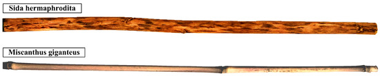 Naturally scaled Sida hermaphrodita and Miscanthus giganteus specimens with the same length.