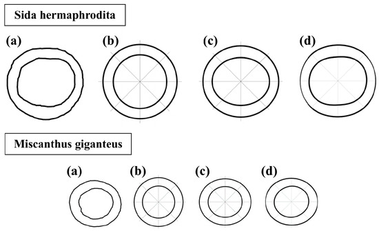 The factor of the specimens’ geometry deviating significantly from the ideal straight rod with a tapered cross section can cause a noticeable discrepancy when interpreting laboratory test results. Estimating the error interval obviously requires many trials and wider statistical analysis. The simple statistics presented in the paper were based on a mean and a standard deviation. They should be further extended, as shown by Giaccu et al. [32], who applied a sensitivity analysis to the elastic modulus of plywood determination. An imperfections effect caused by a natural curvature of the samples on the vibration frequencies was small, as verified by numerical models performed with the finite element method. The stiffening effect of nodes (diaphragms) visible on the Miscanthus giganteus stem specimen (Figure 5) requires a separate study, which the authors intend to perform. The shape of a cross section deviating significantly from the adopted circular one does not pose a problem when the specimens are treated as bent bars, because the stiffness depends on the cross-sectional moment of inertia. Such properties are easily determined based on cross-sectional slice scans after suitable graphic processing. Having both moments of inertia and principal axes, the section can be modelled with an ellipse, or elliptical tube, which belongs to the class of the section analysed in the work (see Appendix A.3). The non-uniform tapering of the outer and inner diameters of the pipe’s cross sections remains a considerable problem in modelling the stems. The Bessel functions cannot be used with differences in the two tapers. In such cases, only the numerical methods can be used, as Mabie and Rogers [12] did with doubly tapered rectangular cross-section bars. Finding suitable solutions and approximating polynomials for these cases is the goal of the authors’ further work.