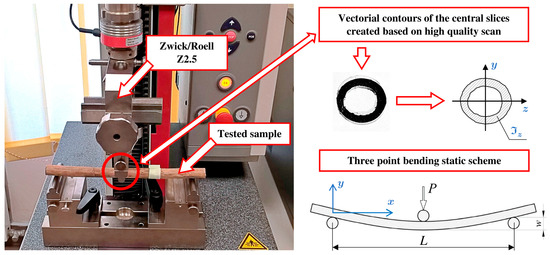 The experiment which can verify the proposed method is a three-point bending test, standardised by ASTM D790 [31]. Such an evaluation, conducted on the Zwick/Roell Z2.5 testing machine, is depicted in Figure 7. The cross-sectional properties were obtained directly from the vectorial contours of the middle slices, and no shape approximations were executed, which should generate reliable results.