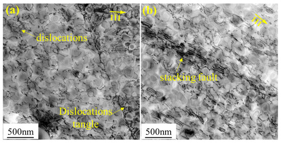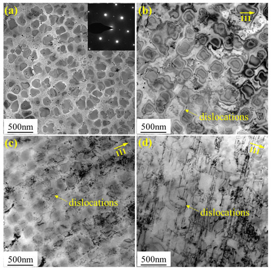 Figure 5 shows the dislocation distribution in the FGH96 alloy after various degrees of room-temperature pre-strain. After 0.33% pre-strain, independent dislocations appeared, and the dislocations were mainly located in the matrix (Figure 5b). After 1.01% pre-strain, a large number of dislocations were found both in the matrix and the γ′/γ interface (Figure 5c). The dislocation density was much higher than that of the 0.33% pre-strained specimen. When the pre-strain reached 6.04%, continuous dislocation lines appeared and the dislocation lines were parallelly distributed (Figure 5d). At this point, significant plastic deformation and strain strengthening occurred. The dislocation density inside the alloy significantly increased.