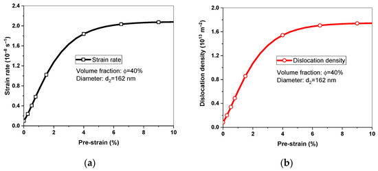 Predicted (a) steady-state creep rates and (b) dislocation density under different pre-strains.