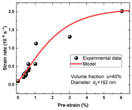 As shown in Figure 7, the predicted steady-state creep rates increased with the increase in pre-strains and finally reached saturation value, which was related to the evolution of dislocation densities because the creep rate was proportional to dislocation density. According to Equation (14), the saturation dislocation density can be obtained as ; it was equal to 1.75 × 1013 m−2. Pre-strains of 6% had no obvious influence on the morphology and distribution of γ′ precipitates and pre-strains mainly affected the density of a/6<112> dislocations; therefore, an exponential function of dislocation density was adopted to identify the pre-strain effect.