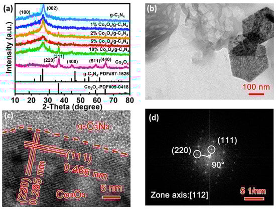 (a) XRD patterns; (b) TEM; (c,d) HRTEM and corresponding FFT images of 5% Co3O4/g-C3N4.
