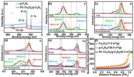 The analysis of X-ray photoelectron spectroscopy (XPS) provides insight into the surface composition and chemical changes in each sample. From the full survey spectra of samples in Figure 3a, it was found that Co, C, N, and O elements were detected in 5% Co3O4/g-C3N4, and the molar ratio of C:N:O:Co in 5% Co3O4/g-C3N4 was about 48:49.6:2:0.3, which further confirmed the complexation of Co3O4 with g-C3N4. The high-resolution XPS spectra of the C 1s spectra at energies of 288.11 eV, 286.54 eV, and 284.66 eV belong to the C-O bond and the N-C=N bond in Figure 3b and Figure S1. The peaks of the N 1s spectra (Figure 3c) are located at 404.71 eV, 400.47 eV, 399.06 eV, and 398.43 eV, respectively, which can be attributed to sp2-hybridized nitrogen C-N=C, tertiary nitrogen N-(C)3, and primary nitrogen H-N-(C)2 [10,12]. The peaks of the O 1s spectra can be shown in Figure 3d, except peaks at 530.38 and 529.17 eV and at 532.35 and 531.42 eV can be found, which originate from the O-C=O and C-O groups produced at the interface of Co3O4 and g-C3N4 [33,36]. The Co 1s energy spectra of Co3O4 and the Co 2p energy spectra of 5% Co3O4/g-C3N4 samples (Figure 3e) showed four characteristic peaks at 795.13 eV, 794.03 eV, 780.03 eV, and 778.68 eV, which can be ascribed to the Co-O and Co=O bonds [27,37]. The effect of photocatalytic degradation is influenced by the specific surface area of the material, and the surface area of different samples was investigated by the N2 adsorption–desorption technique (BET). The g-C3N4 exhibits a typical type IV isotherm with H3-type hysteresis loops, and its mesoporous structure may be due to the stacking of the g-C3N4 (Figure 3f). The surface area of g-C3N4 is about 128.5 m2/g as calculated by the model that comes with the instrument. The higher specific surface area is attributed to the large-scale nanosheet morphology of g-C3N4. The specific surface area of the 5% Co3O4/g-C3N4 composite was slightly decreased after combining with Co3O4, probably since the decrease in specific surface area caused by the interfatial contact between Co3O4 and g-C3N4. The interfacial effect of 5% Co3O4/g-C3N4 promotes the adsorption of pollutants by the catalyst, and the abundant active sites are conducive to efficient photocatalytic reactions.