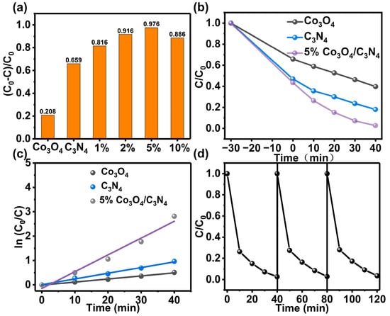 (a) Photodegradation rate of RhB by different samples under simulated sunlight for 40 min; (b) g-C3N4, Co3O4 and 5% Co3O4/g-C3N4 photocatalytic degradation of RhB with time; (c) photocatalytic reaction kinetics; (d) stability test of 5% Co3O4/g-C3N4.