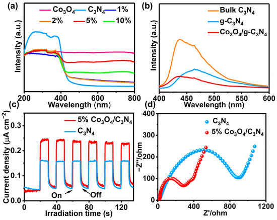 Testing the UV–vis diffuse reflectance spectroscopy (DRS) of catalysts can provide insight into their light absorption capabilities and help in studying their optical properties. It can be seen from Figure 5a, the absorption edge of g-C3N4 is about 450 nm, and there is almost no response in visible region beyond 450 nm. However, the absorption of 5% Co3O4/g-C3N4 is significantly stronger in visible light due to the interfacial effect formed between Co3O4 and g-C3N4, which helps to improve the photocatalytic activity of the catalyst [38,39,40]. The photoluminescence (PL) spectra show that the fluorescence intensities of g-C3N4 and Co3O4 were significantly higher than 5% Co3O4/g-C3N4, which indicates a higher complexation rate of photogenerated carriers on Co3O4 and g-C3N4 [41,42] (Figure 5b). To further demonstrate that 5% Co3O4/g-C3N4 has better photogenerated charge separation efficiency, the time-dependent photocurrent of samples was analyzed. The 5% Co3O4/g-C3N4 catalyst exhibited a higher photocurrent response intensity compared with single g-C3N4, which indicates that the composite catalyst promotes the separation and transfer of photogenerated electron–hole pairs in Figure 5c. Furthermore, the 5% Co3O4/g-C3N4 catalyst also has a smaller arc radius in the Nyquist plot of electrochemical impedance spectroscopy (EIS), which further suggests that the 5% Co3O4/g-C3N4 catalyst has better photogenerated carrier separation efficiency (Figure 5d and Figure S2) [43,44]. Therefore, the stronger photocurrent response and the smaller charge transfer impedance suggest that the photogenerated electron–hole pairs can be effectively separated in 5% Co3O4/g-C3N4.
