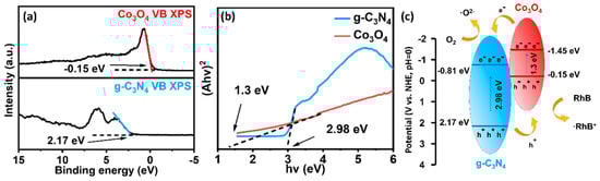 Based on the XPS valence band (XPS-VB) spectral analysis, the VB maxima of Co3O4 and g-C3N4 can be determined to be −0.15 and 2.17 eV, respectively (Figure 6a); therefore, the conduction band (CB) minima of Co3O4 and g-C3N4 can be easily calculated as −2.92 and −3.08 eV. By analyzing the DRS spectra, the bandgaps (Eg) of Co3O4 and g-C3N4 were obtained to be 1.3 and 2.98 eV, respectively (Figure 6b). Based on the above analysis, a type-II heterojunction [2] photocatalytic mechanism is proposed in Figure 6c. The 5% Co3O4/g-C3N4 photocatalyst was excited beneath light irradiation and generates electron and hole pairs, and transferred the electrons from the CB of Co3O4 to g-C3N4. Thanks to the intrinsic force field shaped by interface contact between Co3O4 and g-C3N4, whereas the holes on the VB of g-C3N4 are often transferred to Co3O4. The Co3O4 can produce more photogenerated electrons on the CB of g-C3N4 that can promote the conversion of superoxide radicals (•O2−) and accelerate the conversion of RhB to the subsequent mineralization products.