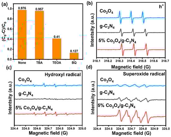 To explore the active species in the 5% Co3O4/g-C3N4 photocatalytic degradation of RhB, a series of free radical capturing experiments was performed (Figure 7a). Tertiary butanol (TBA), triethanolamine (TEOA), and benzoquinone (BQ) were used as the capture agents of •OH, h+ and •O2−. After 40 min of light irradiation, it was found that the degradation efficiency of RhB by 5% Co3O4/g-C3N4 was significantly inhibited by the addition of TEOA and BQ, while the degradation effect did not change significantly after the addition of TBA. The radical capturing experiments indicated that the active species within the degradation of RhB by 5% Co3O4/g-C3N4 were in the main •O2− and h+, however not •OH. In order to further verify the results, an electron spin resonance (ESR) analysis was carried out. After 10 min of irradiation with a Xe lamp (300 W), the 5% Co3O4/g-C3N4 surface produced strong •O2− and h+ signals (Figure 7b,c), while almost no signal of •OH appeared (Figure 7d), proving that •O2− and h+ are the main reactive groups in the reaction system, which is in line with the results of the radical capturing experiments. In addition, it was often found that the signals of •O2− and h+ on the surface of 5% Co3O4/g-C3N4 significantly exceeded those of g-C3N4, indicating that the created heterojunction will higher separate the photogenerated carriers, confirming the results of the previous analysis.