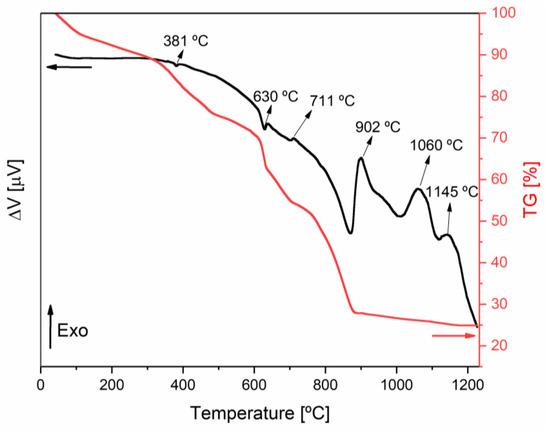 The thermal differential and thermogravimetric analyses (DTA/TGA) were made with Hitachi STA7300 equipment in an oxidative atmosphere (140 mL N2 and 60 mL O2) from room temperature up to 1300 °C using a heating rate of 5 °C/min, allowing it to determine the heat treatment temperatures to apply.