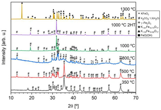 Figure 2 shows the powder XRD diffractograms obtained for the samples with different heat treatments. Table 1 shows the phase’s composition and the amount present in each sample after heat treatment. Although their difference in percentages, heat-treated samples at 350, 500, and 800 °C, all have crystallographic phases compatible with maghemite ( and potassium carbonate (). Raising the heat treatment temperature to 800 °C, it is possible to observe the existence of potassium carbonate and the formation of the potassium ferrite ( phase. This formation is consistent with the existence of the exothermic phenomenon at 711 °C obtained in the DTA. These two phases are present in the samples with heat treatments at 800, 1000, and 1000 °C with two heat treatments. The existence of potassium carbonate in these phases is consistent with what is reported in the literature [8] and is due to the caption of CO2 and H2O from the surrounding ambient air. This makes it difficult to obtain a pure phase without having a controlled environment. Increasing the temperature to 1300 °C, we see a decline in the desired phase (KFeO2), as well as the formation of transition phases, which was a reason to not characterize this sample further.
