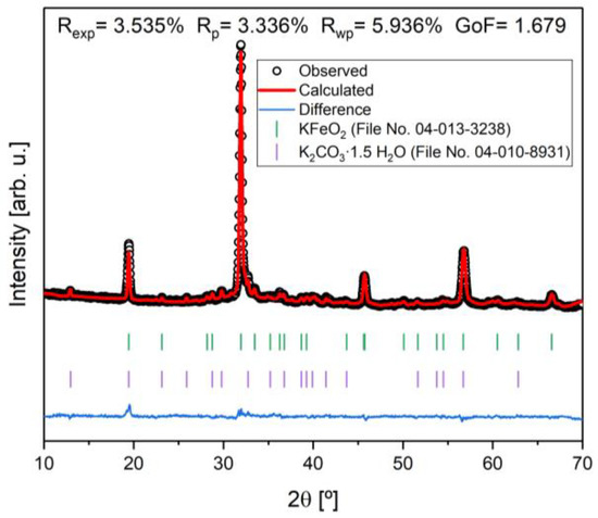 To further investigate the sample with the highest percentage of potassium ferrite, a Rietveld refinement was performed, as shown in Figure 3. Taking into account the fit, that Rwp ≥ Rexp, that is higher than 1, and that the goodness of fit (GoF), defined by GoF = , is close to one, it is revealed that the quality of the refinement is good [20,21].