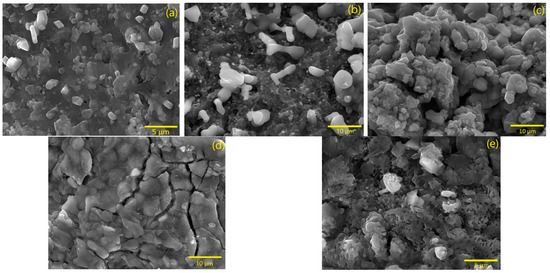 The obtained micrographs for the samples with different heat treatments through an SEM analysis are presented in Figure 6. For the sample heat-treated at 350 °C, the existence of irregularly shaped grains is observed with an average size of 1.40 . The sample treated at 500 °C, which has the same phases as the sample heat-treated at 350 °C, the grain size augmented to 5.44 and a rod shape was observed, which is characteristic of maghemite [27]. In the sample treated at 800 °C, in which the KFeO2 phase is detected, by XRD results (Figure 2), a hexagonal grain habit characteristic of KFeO2 [28] is shown, corroborating the previous results. In addition, there is present an aggregation of grains and a decline in average grain size to 2.40 . For the other samples, the coalescence phenomenon is detectable, as the average grain size is much bigger than in the other samples.