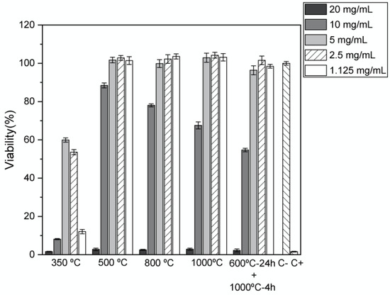 Figure 7 reports the results of the cytotoxicity tests made in accordance to standard ISO-10993. For these tests to be relevant, they must reproduce, as much as possible, the operating conditions of a biomedical material [29,30,31]. The meaningful concentration range chosen for extract preparation was from 1.125 mg/mL to 20 mg/mL. The results show that for the highest concentration tested, all heat treatment methods result in cytotoxic materials. Heat treatment at 350 °C results in materials that are either moderately or severely cytotoxic. Excluding this sample, it is possible to observe that for concentrations until 5 mg/mL, the other samples are non-cytotoxic.