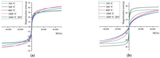 For both temperatures used to measure the hysteresis cycle, 5 and 300 K (Figure 8), it is possible to see that all curves are close to saturation; hence, it is considered that within an uncertainty < 10%, the values of magnetization at 50 kOe are a good estimate for the saturation magnetization. In the samples heat-treated at 350, 500, and 800 °C, at 5 K, the estimated saturation magnetizations were 33.3, 33.9, and 42.8 emu/g, respectively. At 300 K, they were 25.2, 28.2, and 23.74 emu/g, respectively. For these three samples, XRD characterization suggests the presence of a phase. According to the literature, this phase presents a saturation magnetization of 74 emu/g [32] at 300 K, and this is a way to explain the high magnetization of these samples compared to others, considering the diamagnetic behaviour of potassium carbonate (χ = −59.0 × 10−6 cm3/mol) [33]. The samples heat treated at 1000 °C also presents a high magnetization, suggesting that potassium ferrite will also have a high magnetization.