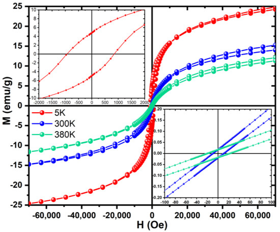 To further analyze the magnetization curve of the sample that had the biggest percentage of potassium ferrite, meaning the sample heat-treated at 1000 °C with 2 heat treatments, a SQUID was used. Hysteresis cycles were obtained at the temperatures of 5, 300, and 380 K, as observed in Figure 9. From this figure, it is clear that the area of the hysteresis cycles is not null. In this manner, this can be one of the heat dissipation mechanisms of these particles. This shows, as expected, that the particles are not superparamagnetic once the grain size is micrometric, not agreeing with the suggestions of some of the literature for this crystal phase [5].