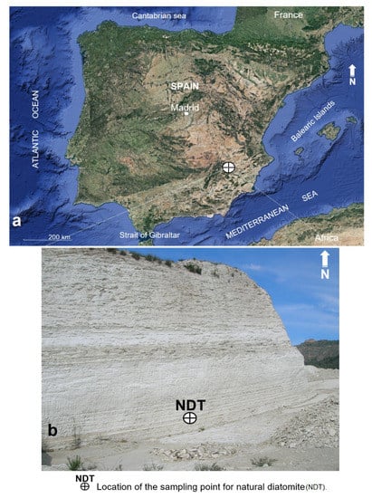 To carry out this research, a volumetric sample of 50 kg was taken directly from a diatomite outcrop, courtesy of the company CEKESA. The sampling point is located in the vicinity of the municipalities of Hellín and Elche de la Sierra, both belonging to the Province of Albacete, in the southeast of the Iberian Peninsula (Figure 1a,b). Macroscopically, the rock color varies between white and beige yellow; it is not very dense and is marked by structures and microstructures of fine to very fine stratification. Its low cohesion, relative friability, and basal-type fracture shape are to be noted.