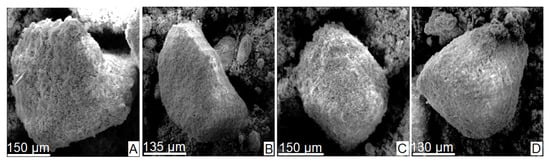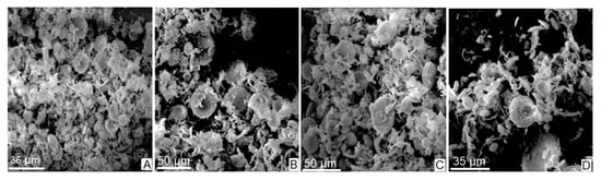 Figure 2A–D shows a series of microphotographs obtained by scanning electron microscopy (SEM) during the analysis of the natural diatomite sample (NDT). As can be observed, the sample consists of a compact agglomerate of frustules of organic origin consisting of the remains of multiform diatom algae skeletons. From a morphological point of view, the frustules have mostly radial or centric symmetry, are trelisoid, pennate, and, to a lesser degree, gonoidal. They also have a porous and striated appearance.