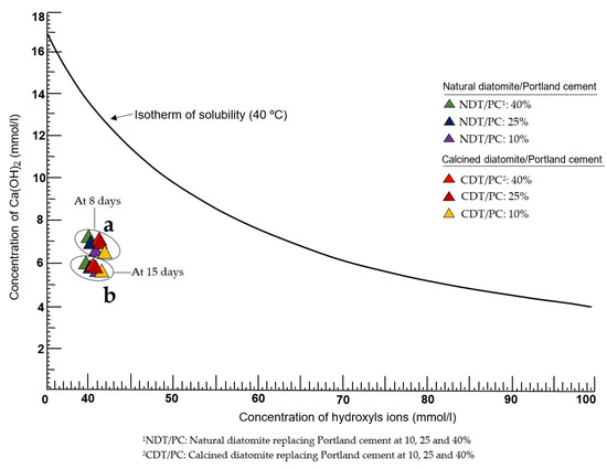 At 8 days of testing (Figure 5a), all analyzed samples are at a visibly deep position below the isothermal curve of CaO solubility, and this factor itself definitively determines the pozzolanic character of the sample [29]. Although the general trend in this period is a spatial concentration of all the results, the truth is that there are small variations that are relevant and should be highlighted. First of all, the samples of diatomite in its natural state (NDT) are located in an orderly manner and descend on the left side of the graph. The most pozzolanic is composed of the ratio NDT/PC: 10%, and the least pozzolanic is NDT/PC: 40%, which leaves sample NDT/PC: 25% in an intermediate position. Immediately to the right are the samples in a calcined state (CDT/PC: 10–25–40%), which follow a pattern similar to the previous ones. It is evident that the pozzolanic properties are increased from the CDT/PC formulations: 40% to the CDT/PC: 10%. Although the positions of both groups of samples in the graph are very close to each other, it can be established that heat treatment significantly improves the pozzolanic character [39].