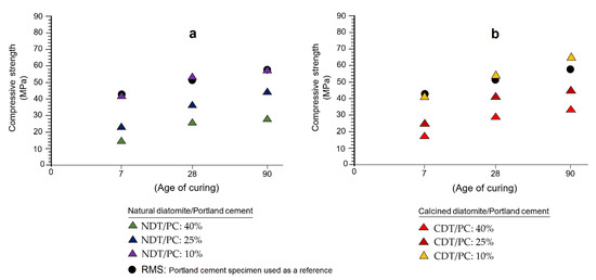 According to Figure 6b, it is evident that the previous pattern is repeated, where significant increases in mechanical strength can be verified throughout the three test periods. In addition to the three facts discussed in the previous paragraph, in this case a fourth fact is revealed: the effect produced by the heat treatment on the sample. Indeed, this factor seems to cause a strengthening of the pozzolanic capacity of diatomites once calcined, which manifests in the form of significant increases in mechanical resistance. Note how these values increase mainly after 28 days, highlighting the fact that in this period, the specimens made with the CDT/PC: 10% ratio quantitatively exceed the mechanical strength value of the reference specimen (RMS). Some authors, such as Martín et al. [43], have demonstrated the veracity of these arguments in their research with other varieties of pozzolans.
