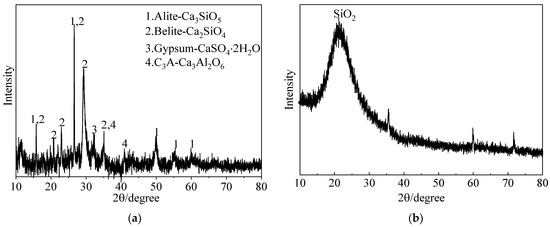 The MC used in this study was the K1000 type of P.O 52.5 Portland cement (Qing Yun Kang Jing Building Materials Co., Ltd., Dezhou, China). Its performance was confirmed to adhere to the Chinese standard GB/T 35161-2017 [24]. The undensified SF was produced by Bo Run Building Materials Co., Ltd., Zhengzhou, China. The UEA (Wuhan Jianfeng Hongda Building Materials Co., Ltd., Wuhan, China) with a low alkalinity content was used to enhance the expansion performance of hardened grouts. The UEA conformed with Chinese standard GB/T 23439-2017 [25]. The details of the chemical components above are shown in Table 2, which was measured using X-ray fluorescence (XRF) (S8 Tiger, Bruker Technology Co., Ltd, Beijing, China)). NSP, one of the naphthalene sulfonated-formaldehyde copolymers, was produced by Chen Qi Co., Ltd. in Shanghai, China, and has a pH value of 8.00 (20 °C). In this study, a 50% alkali-free accelerator based on aluminum sulfate (AS) (Shanxi Feike New Materials Technology Co., Ltd., Yuncheng, China) was used. Table 3 presents the basic physical and chemical properties of AS provided by the manufacturer. The MCSF64-based slurry was prepared using tap water, and the designed raw materials of the slurry are shown in Figure 1. The SEM images of MC and SF, presented in Figure 2, show that SF particles are mostly spherical, and some groups of agglomerates could be observed, while the shape of the MC particles was angular and irregular. The X-ray diffraction (XRD) spectra (Smartlab9, Rigaku Corporation, Tokyo, Japan)) of MC and SF, which are presented in Figure 3, indicate that SF is primarily composed of amorphous silica. Furthermore, the SF has weak impurity peaks, which implies the presence of impurities in the SF. As can be seen from the XRD spectra, alite and belite were the main mineral phases in MC.