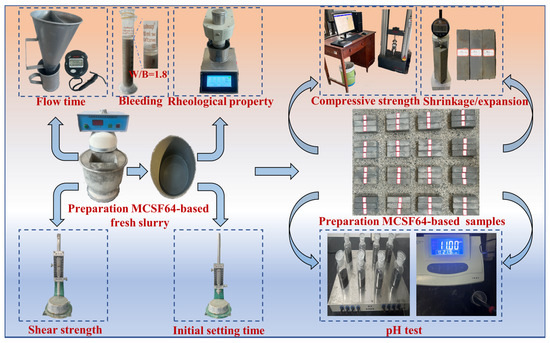 Based on the performance requirements outlined in Table 1, the main properties of the MCSF64-based low-pH grouting materials investigated in this paper include pH value, particle size, flow time, plastic viscosity, yield stress, initial setting time, shear strength, and compressive strength. Bleeding capacity was not studied, because it was tested and observed in the laboratory that even with a W/B ratio of 1.8, the bleeding capacity of the MCSF64-based slurry remained below 5% after 2 h from preparation, indicating that the slurry could be considered stable according to SL62-2014 and EN 12715 standards. The test process is depicted in Figure 4, and the specific test methods for each property of the grouting materials are as follows.