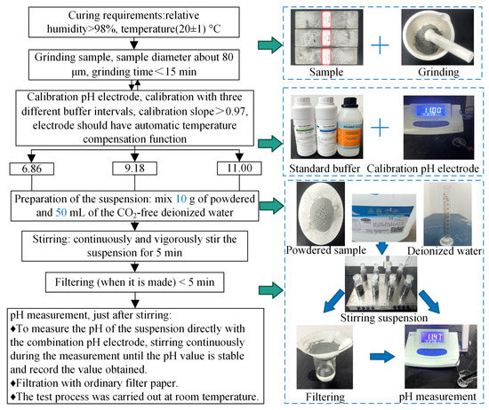 pH test: The measurement of pH in low-pH cementitious materials is a critical aspect of material characterization, particularly in the context of HLRW’s construction applications. The routine ex-situ leaching (R-ESL) method has been established as the standard method for this purpose by the Spanish National Research Council (CSIC) [26]. Recent comparisons between R-ESL and the pore fluid expression (PFE) method have demonstrated that R-ESL exhibits high levels of accuracy, repeatability, and reproducibility. However, the 1:1 solid to liquid ratio utilized in R-ESL can result in difficulties during filtrate extraction and lower test efficiency due to the requirement of nitrogen bubbling. To address these issues, a simplified ex-situ leaching (S-ESL) method was used in this study to measure the pH of grouts. The solid to liquid ratio was increased to 1:5 in S-ESL, thereby enabling the extraction of more filtrate. Moreover, the dilution during the preparation of the suspension was insufficient to desaturate the solution with respect to the C-S-H phase, and the measured pH was representative of the pore solution [27]. The experiments were conducted in an air-conditioned room with a controlled temperature of 21 ± 1 °C. The pH of the samples was measured using a PHS-3CB digital display acidity meter (Shanghai Yueping Scientific Instrument Co., Ltd., Shanghai, China). Figure 5 illustrates the test procedures of S-ESL.