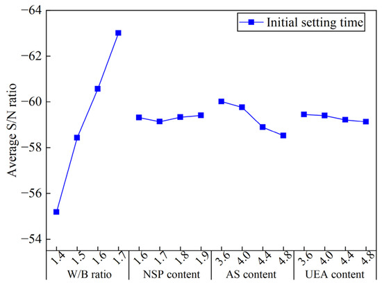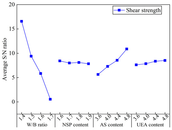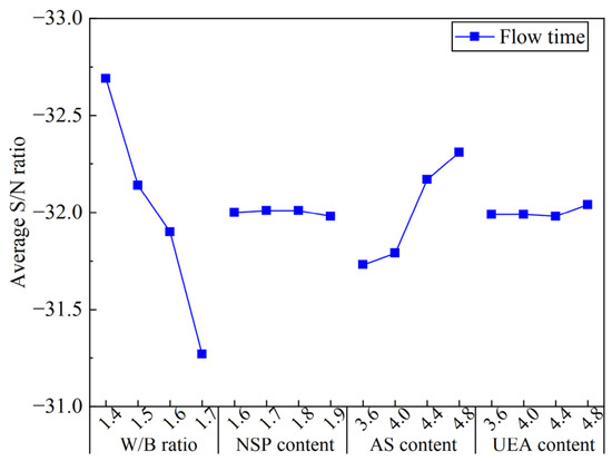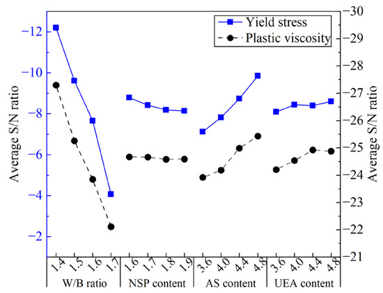Figure 11 shows the ASNR values for YS and PV in the MCSF64-based slurry for different factors. As shown in Figure 11, the variation of the W/B ratio on YS exhibited a similar trend to that of PV. Specifically, the ASNR decreased dramatically as the W/B ratio increased, which can be attributed to the higher amount of free water leading to lower internal friction force and a greater lubrication effect on MC and SF particles. The ASNR of YS and PV decreased as the NSP content increased. This observation is attributable to the fact that NSP, being an anionic surfactant, can directionally adsorb onto the surface of MC particles, lowering the solid–liquid interface energy and forming a double-electron layer solvation membrane via electrostatic repulsion. As a result, the flocculation structure caused by the high surface energy of MC and SF begins to decompose into smaller ones, releasing more free liquid, and improving the fluidity of fresh slurry. It is noted that the variation in the mean S/N ratio of PV is not visible compared to YS. A possible reason for this phenomenon is that the change in PV was small due to the uniform dispersing of particles in suspensions, thus the effect of NSP on PV is less remarkable. The available literature [39] also reports similar results. The ASNR of YS and PV increased with a small increase in the AS content. This is because AS can react with C3A or Ca(OH)2 to form AFt, and a large amount of free water is consumed in the formation process of AFt, which increases the internal friction within hydration products, leading to an increase in the values of the rheological parameter of fresh slurry. The variation in the ASNR presented a rising trend as UEA content increased, which indicates that the addition of UEA increased the rheological parameter’s values by consuming a part of the water in the slurry.