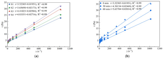 In terms of cement-based slurry, rheological properties are typically characterized by dividing the slurries into Newtonian fluid, Bingham fluid, and power law fluid categories based on the water–cement ratio [37]. However, incorporating 40% SF in binary low-pH grouting material may result in a rheological model that differs from the conventional cement-based slurry. Usually, the rheological parameters of slurry can be obtained by fitting different rheological constitutive equations on the diagram of shear stress (τ) and shear rate (γ), which is helpful in evaluating the rheological properties of MCSF64-based slurries. Figure 9a shows the test data and fitting curves of fresh MCSF64-based slurry (S1 to S4).