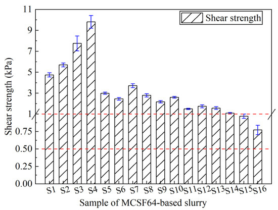 To acquire a satisfactory grouting effect, the rheological parameters of the slurry should be as low as possible to maintain superior flowability and groutability. In this regard, the PV and YS of MCSF64-based fresh slurries were investigated, as shown in Figure 10. The results indicate that the rheological parameters of all fresh slurries examined met the requirements outlined in Table 1. Notably, mix S4 demonstrated the highest YS of 4.83 Pa and PV of 27.16 mPa·s, while mix S16 exhibited the lowest YS of 1.28 Pa and a relatively lower PV of 12.02 mPa·s. This behavior can be attributed to the dominant effect of the W/B ratio and AS content, with mix S16 containing a higher W/B ratio and lower AS content compared to mix S4.