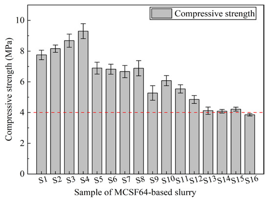 The evaluation of the fluidity and workability of fresh slurry heavily depends on the FT. Typically, slurries with smaller FT values tend to have better groutability and spread ability. Figure 7 displays the FT results for fresh slurries (S1 to S16). As demonstrated in Figure 7, all fresh slurries satisfied the requirements specified in Table 1, where the FT was less than 45 s. The FT of the slurries varied between 35.56 s and 44.36 s. It is noteworthy that S4, which had a 1.4 W/B ratio, 1.9% NSP, 4.8% AS, and 4.8% UEA, exhibited the highest FT among all MCSF64-based slurries. Obviously, the W/B ratio had a significant impact on FT, and S16 had a higher W/B ratio, as well as lower AS and UEA contents, hence showing the lowest FT.
