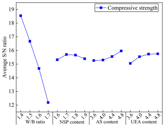 In Table 7, the signal-to-noise (S/N) ratios given by FT, YS, PV, and IST are calculated using Equation (3), while SS and 28-day UCS are calculated using Equation (5). The average S/N ratio (ASNR) refers to the average value of all S/N ratio values at a certain level with a specific factor. In this paper, minitab26 was used to analyze the test data.