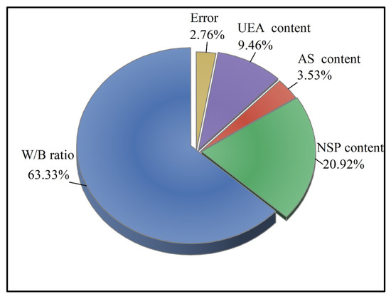 According to the methodology mentioned above, the Taguchi experimental design method was utilized to select four factors, namely, W/B ratio, NSP content, AS content, and UEA content. After conducting extensive exploratory trials, the corresponding levels of the four selected factors were identified and are listed in Table 4. The content of UEA was determined by the manufacturer, who recommends that the content of UEA should be between roughly 6% and 8% by mass of cement. Therefore, the UEA content in the orthogonal test ranged from 3.6% to 4.8% by mass of binder. The L16 (45) orthogonal test scheme was employed for the experiment, as shown in Table 5.