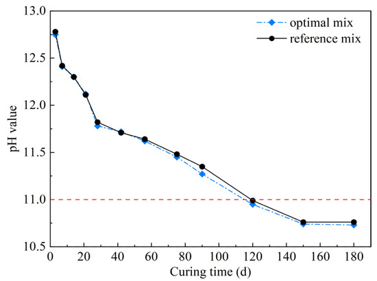 Figure 19 shows plots of the pH variation versus curing time. As shown in Figure 19, the pH values for the optimal mix and reference mix were approximately 12.75–12.78 after curing for 3 day. This observation can be interpreted as implying that, on the one hand, the pozzolanic reaction between SF and CH formed during cement hydration begins to occur after 3 days [33,48]. On the other hand, the pore solution, primarily composed of Na+, K+, Ca2+ and OH−, had a high ionic strength, resulting in a relatively higher pH value. As time went by, the pH values of two different mixes gradually decreased, and finally converged to 10.74–10.76 after about 150 days. The target pH value was obtained after curing for 120 days. In addition to this, it is observed that the pH value of the optimal mix is slightly lower when compared with the reference mix. This is mainly because the formation of AFt reduces the Ca2+ concentration, hence the measured pH value is comparatively decreased. The pH variation of the reference mix in this study is similar to that in previous investigations [11]. The mechanism of pH reduction with curing time can be explained by the following factors [8,12,49]: (i) the MC is diluted, lowering the alkali and hydroxide concentrations in the pore solution significantly; (ii) the CH is consumed by the pozzolanic reaction, leading to lower Ca2+ concentration in the pore solution; (iii) the additional C–S–H gel with a low Ca/Si ratio formed by the reaction of the SF with CH enhanced its alkali absorption capacity, which in turn reduced the equilibrium pH.