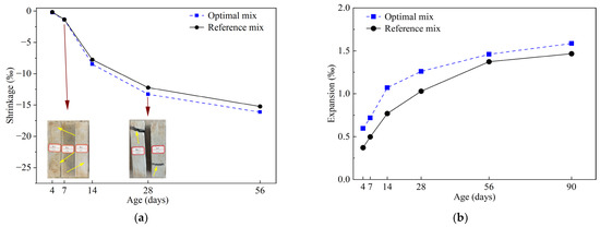 Shrinkage and expansion rates of optimal mix and reference mix with age: (a) shrinkage rate; (b) expansion rate.