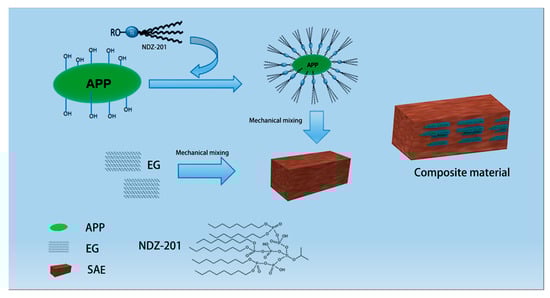 Mica powder with a mass fraction of 50% and styrene-acrylic emulsion with a mass fraction of 40% were weighed with an electronic balance and added to a plastic jar; the result was fully stirred and dispersed at 1000 r/min, and recorded as AE-1. Then the modified ammonium polyphosphate (MAPP) and expandable graphite (EG) were added to the styrene-acrylic emulsion instead of the mica powder with a mass fraction of 25% for full stirring, and recorded as AE-2 and AE-3, respectively. The preparation process of composite materials and the principle of NDZ-201 modified APP are shown in Figure 1. the damping fireproof composite materials were produced by replacing the 25% mass fraction of mica powder with MAPP and EG in the same way in different mass ratios (4:1, 3:2, 2:3, 1:4), recorded as AE-4, AE-5, AE-6, and AE-7, respectively.