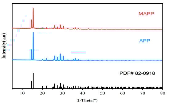 In order to study the effect of titanate coupling agent NDZ-201 ball milling modification on the crystal structure of APP, XRD tests were conducted on APP before and after modification, and the test results are shown in Figure 2. The XRD diffraction pattern of APP was compared with the standard PDF#82-0918 pattern, and it was found that the two basically matched, which proved that the crystal type of APP was APP-II. The positions of diffraction characteristic peaks of APP after modification (2θ = 14.6°, 15.4°, 26°, 27.4°) did not change. In addition, no new diffraction peaks appeared in the XRD pattern of MAPP, which indicates that the crystal structure of APP-II was not destroyed after modification by ball milling with titanate coupling agent NDZ-201.