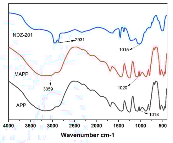 Figure 4 shows the infrared spectra of APP and modified MAPP. The main characteristic absorption peaks of APP are located at 3177 cm−1 (N-H stretching vibration), 1435 cm−1 (N-H bending vibration), 1251 cm−1 (P=O stretching vibration), 1072 cm−1 (P-O symmetric stretching vibration), and 877 cm−1 (P-O antisymmetric stretching vibration) [19,41]. The titanate coupling agent NDZ-201 exhibits an antisymmetric vibration peak of C-H near 2934 cm−1 [42], and a characteristic absorption peak of Ti-O at 1015 cm−1 [43]. When APP was treated with NDZ-201 surface treatment, MAPP showed an antisymmetric vibration absorption peak of C-H at 3059 cm−1, showing a blue shift, which may be related to the inductive effect [43]. In addition, MAPP did not exhibit a new characteristic absorption peak at 1020 cm−1, which may be due to the overlap between the P-O absorption peak of MAPP at 1072 cm−1 and the Ti-O absorption peak of NDZ-201.The appearance of the C-H anti symmetric vibration absorption peak on the surface of MAPP proves that APP was successfully modified by the titanate coupling agent NDZ-201.