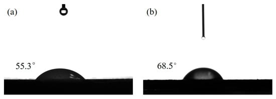 Figure 6 shows the contact angle before and after modification of APP. Because APP itself contains the hydrophilic groups -OH and -NH4+ [45], which show strong polarity, the contact angle measured by the goniometric method is small at 55.3°, and the contact angle of MAPP modified by coupling agent is 68.5°. Compared to the modified MAPP powder, the contact angle increased, which indicates that NDZ-201 coupling agent successfully coated the surface of APP.