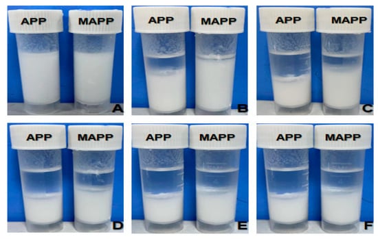 Settlement behavior of APP/MAPP powder in liquid paraffin at different times after ultrasound ((A): 0 h, (B): 0.5 h, (C): 3 h, (D): 12 h, (E): 48 h, (F): 72 h).