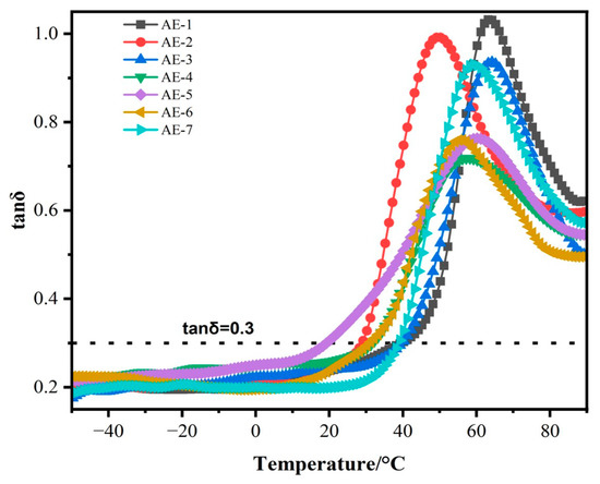 The loss tangent, tan δ, defined by the ratio E″/E′, is often used to characterize the damping properties of materials [1]. The temperature range of tan δ > 0.3 serves as the standard for evaluating damping materials. In order to study the effect of flame-retardant MAPP/EG on the damping performance of composite materials, the tan δ of the composite material was tested at a given frequency. The relationship with temperature is shown in Figure 9. When intumescent flame retardants are added to SAE in place of some mica according to the formula, the tan δ values of the composites all decreased, especially in the APP/EG composites, where tan δ appeared to decrease with the decrease in EG content. This is because the damping properties of polymer-based damping materials are mainly contributed by the inherent viscoelasticity of the matrix [49], but also by the particle–particle friction and particle–polymer friction when the particles are filled with polymer [2]. As shown in Figure 10d, when the EG content in the composite is the highest, the area where EG is wrapped by the resin is the largest. This results in higher tan δ values due to increased interfacial friction between EG and the polymer. When the ratio of MAPP:EG is 1:4, tan δ of the composite is 0.93 and the damping temperature domain is >56 °C. The composite material has good flame-retardant and damping properties.