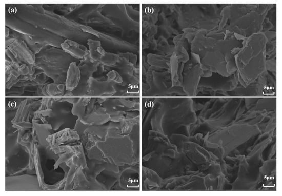 SEM can be used to observe the surface morphology of APP and MAPP particles. As shown in Figure 5a,b, although the surface of APP particles is smooth, there are some attachments on the surface of some particles, which may be due to the strong hygroscopicity of unmodified APP and partial dissolution on the surface [19]. As shown in Figure 5c,d, after coupling agent NDZ-201 and ball milling modification, the size and morphology of MAPP particles showed significant changes compared to the unmodified APP. The size of MAPP particles decreased and the overall morphology showed a flattening, and a larger surface area was obtained. This may be beneficial for sufficient contact between MAPP and polymer materials, thereby achieving better flame retardancy [44].