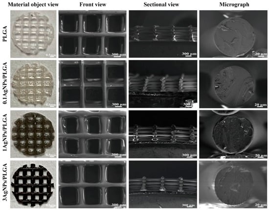 The DIW-printed AgNPs/PLGA scaffolds have a uniform porous structure with interconnected pores, as seen in the three-dimensional representation in Figure 1. The porous microstructure is an important characteristic of the bone scaffold because its high specific surface area facilitates protein adsorption and provides anchoring sites for osteoblasts [37]. When the pore structure of the scaffold is greater than 300 μm, it facilitates the infiltration, adhesion, and migration of bone tissue cells, as well as the growth of blood vessels, which sees benefits in terms of providing nutrients for repairing bone tissue [20]; the minimum acceptable size of the scaffold is approximately 100 µm [38], as pore sizes smaller than 100 µm may prevent angiogenesis [39]. The pore size structure of our scaffolds is greater than 300 µm (Figure 1: front view). Additionally, the presence of gaps between each layer of the scaffolds suggests that the scaffolds were interconnected, and the thickness of the single strand is about 0.1mm (Figure 1. sectional view). It has been demonstrated in vivo and in vitro that pore interconnectivity has a positive effect on the rate of bone deposition and deep cell infiltration [40]. Microscopic images of the scaffolds (Figure 1) revealed uniform fiber diameters (0.15 mm) and a tight composition within the fibers, indicating that the 3D-printed scaffolds had structural homogeneity in terms of filament diameter as well. Figure 1 demonstrates that the printed scaffolds had high structural homogeneity and controlled geometry under the aforementioned process conditions, indicating that the printing parameters can be adjusted according to the bone tissue repair at various sites for therapeutic purposes.