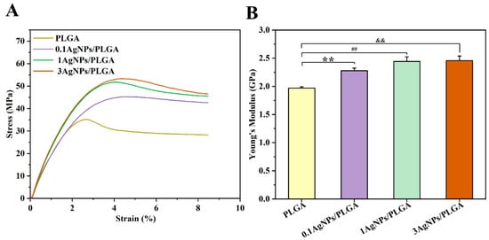The scaffolds used in bone tissue engineering are supposed to have mechanical properties that are compatible with the intended tissue. In the process of bone remodeling and repairing, mechanical force plays an important regulatory role [41]. Tensile testing is widely accepted as a basic test for testing the strength of materials. The most commonly used test is the uniaxial tensile test, in which a specimen is stretched uniformly at a specified rate, and the tensile force and elongation are recorded. The material’s parameters, such as stress-strain curves and Young’s modulus, are deduced from this [42]. Therefore, to characterize the scaffolds’ mechanical properties, we conducted tensile tests. The tests were given an average of three repetitions for each sample [43]. According to the stress-strain curves (Figure 2A), the tensile strength of PLGA was 34.9 ± 0.23 MPa. Meanwhile, with the addition of AgNPs, the tensile strength increased significantly. Specifically, the tensile strength of 0.1AgNPs/PLGA, which was 45 ± 0.17 MPa, and the 1AgNPs/PLGA and 3AgNPs/PLGA were 51.3 ± 0.67 MPa and 52.7 ± 0.51 MPa, respectively. Figure 2B displays that the Young’s modulus of PLGA was 1.96 ± 0.03 GPa. For the AgNPs/PLGA scaffolds, the Young’s modulus, respectively, increased to 2.28 ± 0.04 GPa, 2.44 ± 0.08 GPa, and 2.46 ± 0.08 GPa with increasing AgNP concentration. Fillers typically restrict the mobility of the polymer matrix and increase the rigidity of the scaffolds [44]. In this study, AgNPs were also utilized as fillers to increase the rigidity of the scaffolds because the addition of silver enhanced the Young’s modulus of the AgNPs/PLGA scaffolds, which is consistent with previous research [20]. However, the Young’s modulus difference between the 1AgNPs/PLGA and 3AgNPs/PLGA was not statistically significant (2.44 vs. 2.46, p = 0.535), indicating that the Young’s modulus of the scaffolds may not increase indefinitely with increasing silver concentration. Here, the Young’s modulus values of the scaffolds ranged between cancellous bone (0.02 GPa to 0.5 GPa) and cortical bone (3 GPa to 30 GPa) [45]; these results also support the utilization of AgNPs/PLGA scaffolds for bone tissue engineering applications.