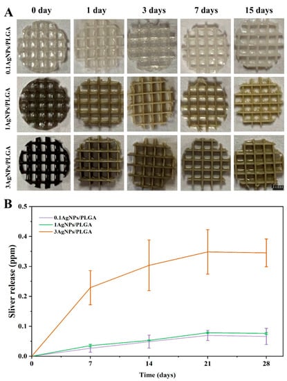 (A) Object view of the scaffolds with different contents of AgNPs: 0.1 wt%, 1 wt%, and 3 wt%, respectively, for 0, 1, 3, 7, and 15 days (every image follows the scale bar of the image at the end). (B) In vitro sliver release curves of scaffolds with different contents of AgNPs: 0.1 wt% (purple), 1 wt% (green), and 3 wt% (orange), respectively, for 7, 14, 21, and 28 days.