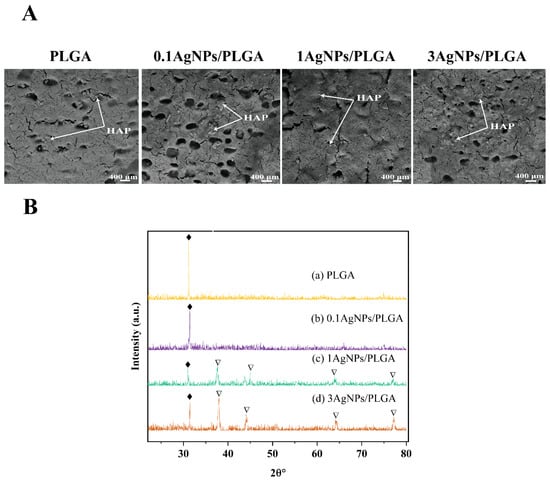 (A) SEM micrographs of the HAP grown on the surface of the 3D-printed scaffolds. (B) XRD spectra of the HAP grown on the surface of the scaffolds; the diamonds (♦) represent HAP and the inverted triangles (∇) represent AgNPs.