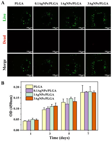 In addition to mechanical properties, biocompatibility is an important property in bone implant materials. We evaluated the suitability of the AgNPs/PLGA scaffolds for the repair of human bone tissue by verifying their cytotoxicity. In this study, the cytocompatibility of the AgNPs/PLGA scaffolds was evaluated using MC3T3-E1, a suitable osteoblast cell line for in vitro testing. Previous studies have demonstrated that materials with an appropriate amount of silver loaded onto their surface exhibit good cellular compatibility and proliferation rates [54]. The viability of MC3T3-E1 cells was assayed using live/dead staining after 3 days of cell culture [55], where the live cells were stained with calcein acetoxymethyl ester (Calcein-AM: green), and the dead cells were stained with propidium iodide (PI: red) under a fluorescence microscope. In this experiment, it was hard to observe the dead cells at the highest AgNP concentration, indicating that there was almost no cytotoxicity and an effective bacterial inhibition effect (Figure 5A). Consistent with the live-dead staining results, the CCK-8 experiment revealed (Figure 5B) that increasing AgNP concentration had no effect on cell viability on days 1, 3, 5, and 7, and that neither the experimental nor control groups exhibited significant cytotoxicity. Some studies have shown that excessive amounts of AgNPs can be toxic to humans [56]. In our study, the scaffolds containing AgNPs were shown to be non-toxic via cellular experiments. As can be seen in Figure 3B, the release of silver from the scaffolds is continuous due to the advantages of the DIW printing technology, which avoided cytotoxicity due to the sudden release of the AgNPs. As a result, the scaffolds that we printed that were modified with AgNPs had good biocompatibility and can be used in humans for in vivo bone tissue repair.